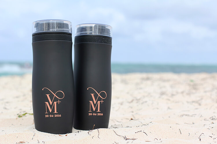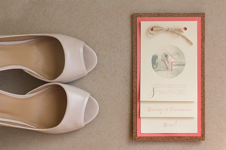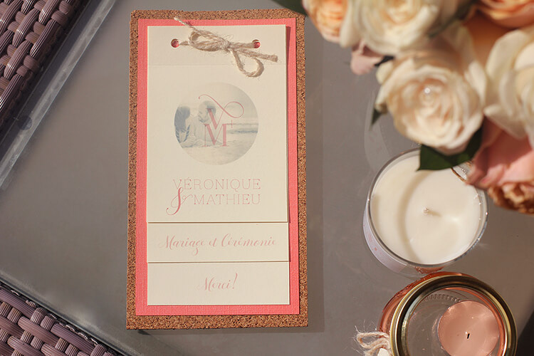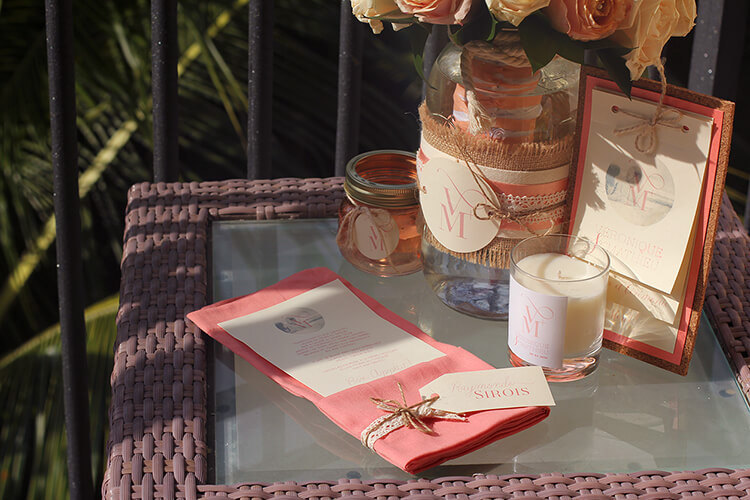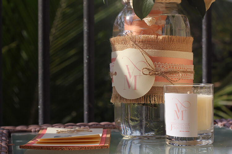 Création du logo de Véronique & Mathieu et plusieurs éléments décoratifs. Nous avons également fait produire des cadeaux à offrir aux invités à l'image de l'événement!